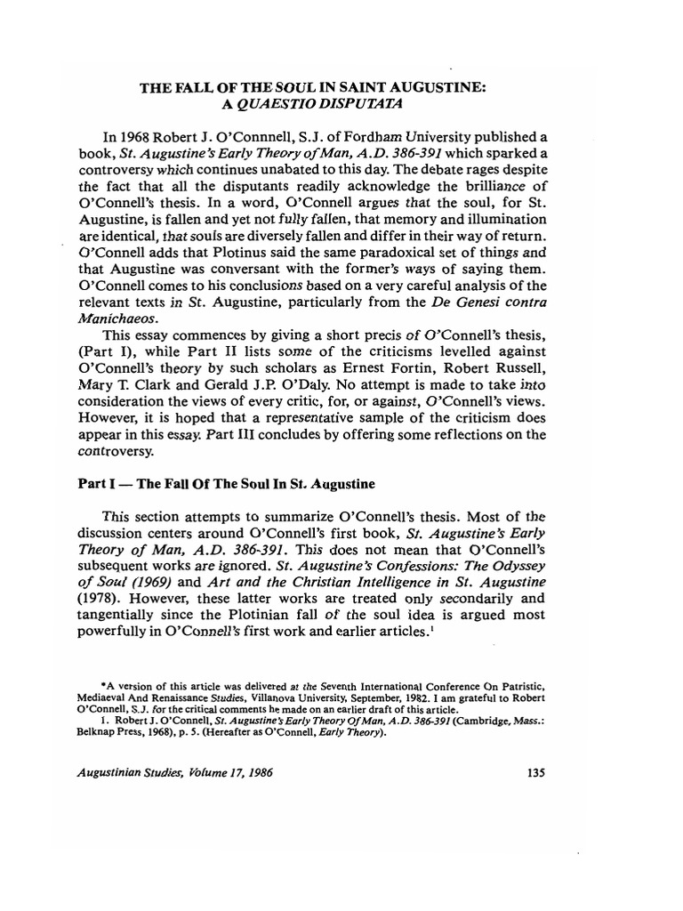 1. Robert J. O'Connell, St. Augustine'sEarly Theory OfMan, A.D. 386-391 (Cambridge, Mass.: