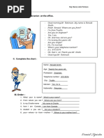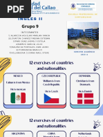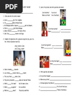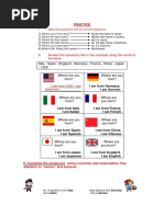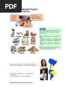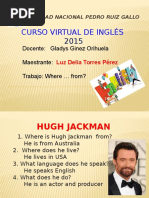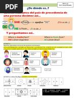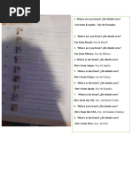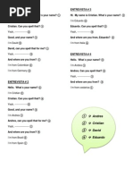 This document contains an English exercise with questions about people's names and where they are from. The exercise includes 6 sections with a question about a person's name and country of origin. The people named are Pedro Suarez Vertiz from Peru, Mercedes Sosa from Argentina, Silvio Rodriguez Dominguez from Cuba, Alberto Plaza from Chile, Alejandro Filio from Mexico, and Joaquin Sabina from Spain. The document provides practice with basic questions and answers in English.
