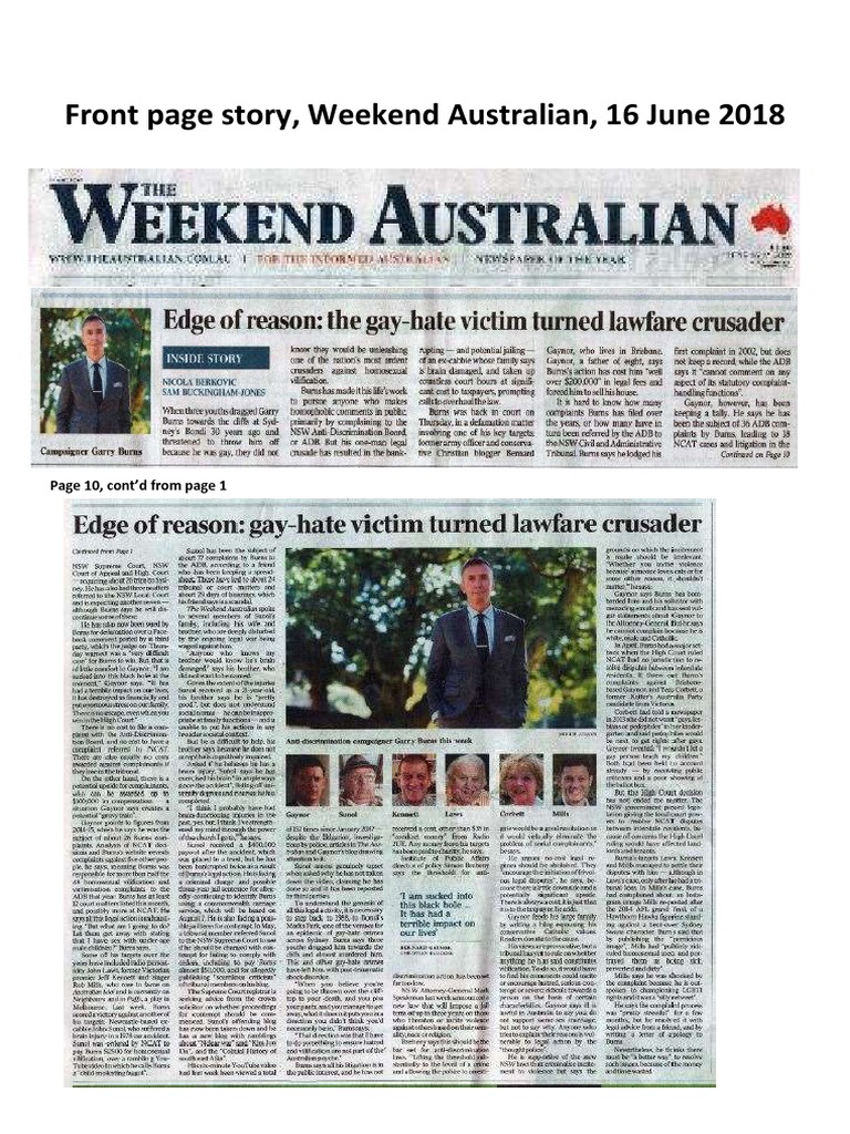 Front page story, Weekend Australian, 16 June 2018