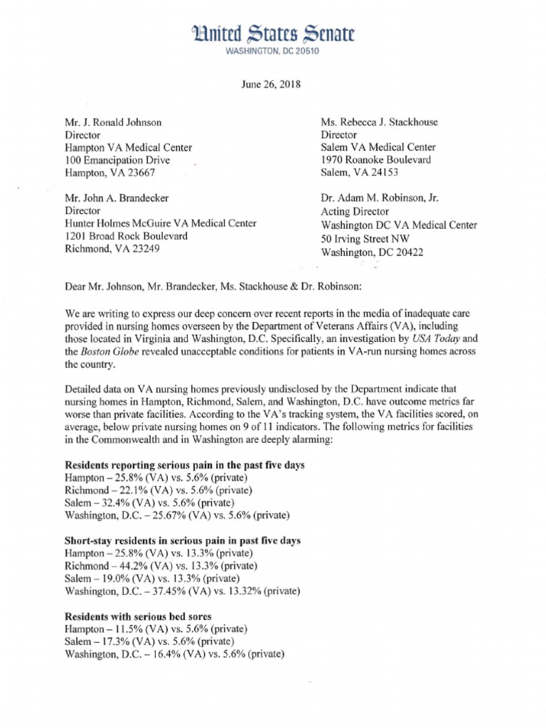 U.S. Sens. Mark R. Warner and Tim Kaine (both D-VA) today pressed the Department of Veterans Affairs (VA) on the quality of care at nursing homes that serve Virginia’s veterans, following an…Full description