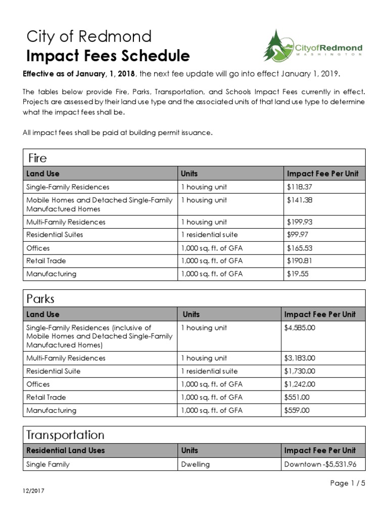 The tables below provide Fire, Parks, Transportation, and Schools Impact Fees currently in effect. Projects are assessed by their land use type and the associated units of that land use type to determine what the impact fees shall be. All impact fees shall be paid at building permit issuance.