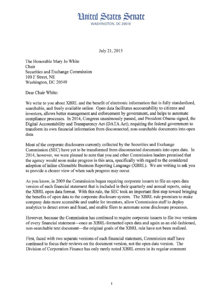 In July 2015, Sen. Warner and Sen. Mike Crapo (R-ID) sent a letter calling on the SEC to implement in-line XBRL.