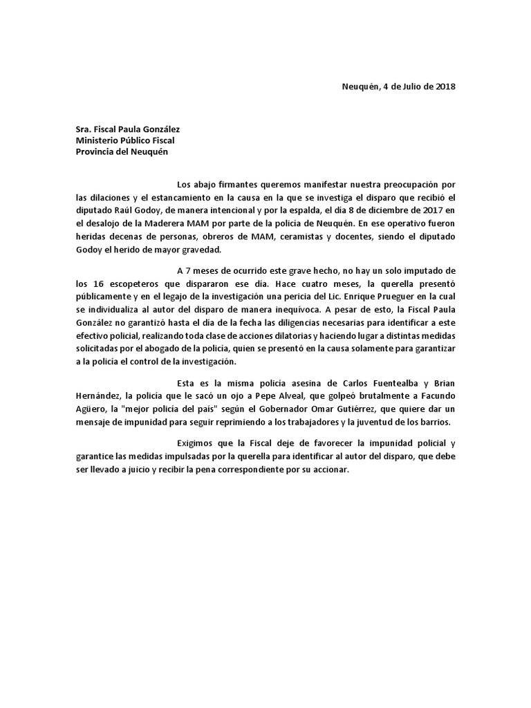 Los abajo firmantes queremos manifestar nuestra preocupación por las dilaciones y el estancamiento en la causa en la que se investiga el disparo que recibió el diputado Raúl Godoy, de manera intencional y por la espalda, el día 8 de diciembre de 2017 en el desalojo de la Maderera MAM por parte de la policía de Neuquén. En ese operativo fueron heridas decenas de personas, obreros de MAM, ceramistas y docentes, siendo el diputado Godoy el herido de mayor gravedad.