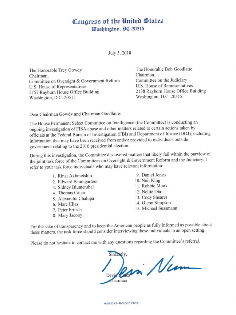 CHM Ltr to OGR and JUD Re Witness Referrals - 5 Jul 18