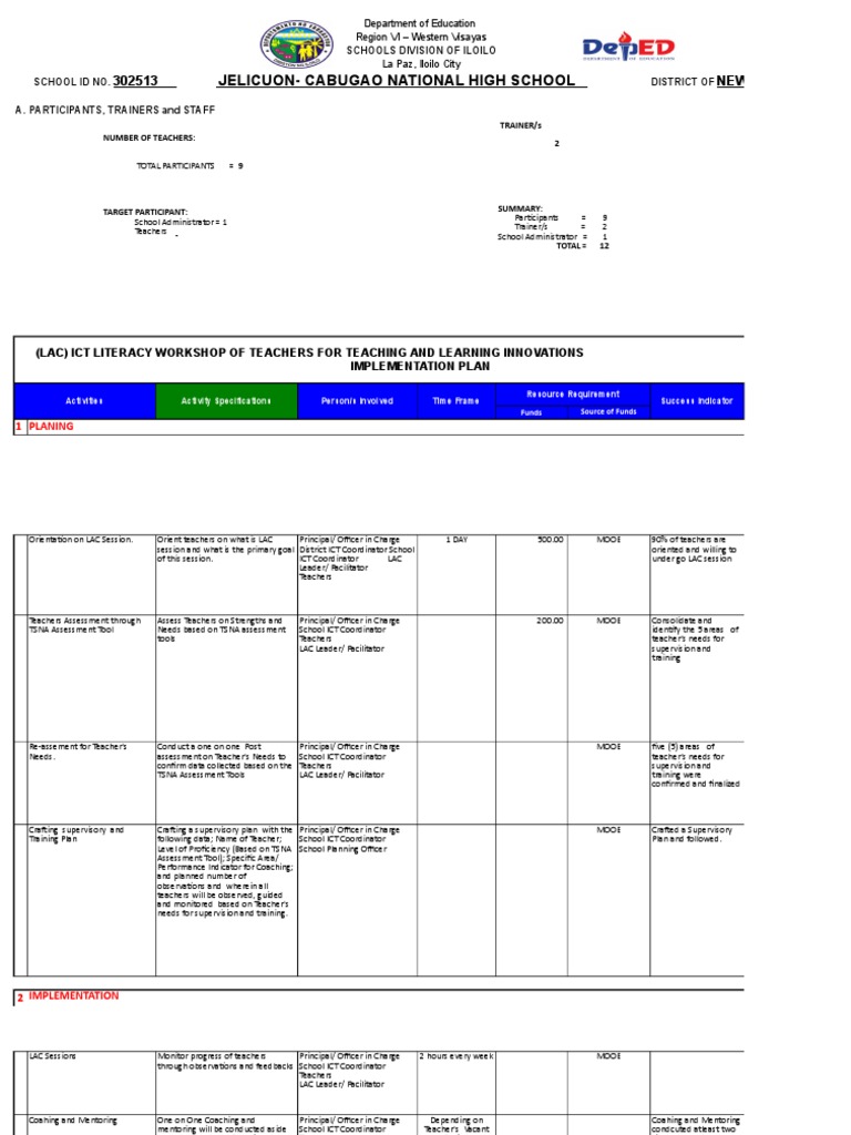 Training Plan following data; Name of Teacher; School ICT Coordinator Plan and followed.