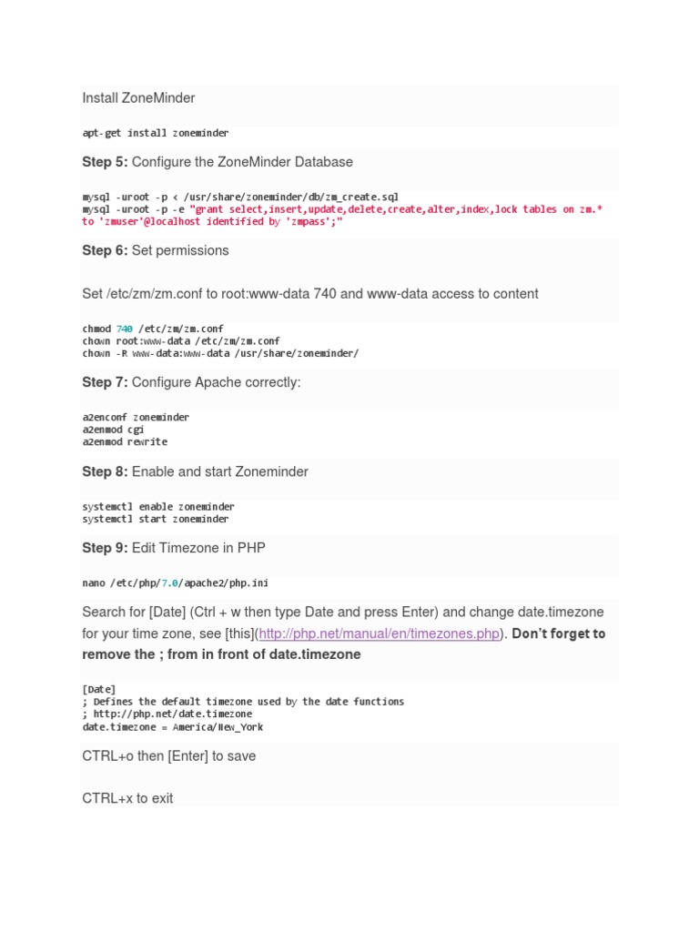 Create Zoneminder database in MySQL (Note: this also creates the default Zoneminder user and permissions