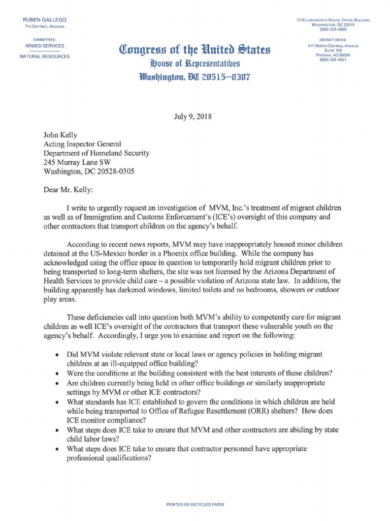 Rep. Ruben Gallego wrote to the Department of Homeland Security's Acting Inspector General, requesting immediate investigation into reports that minor children detained at the U.S.-Mexico bo…Full description