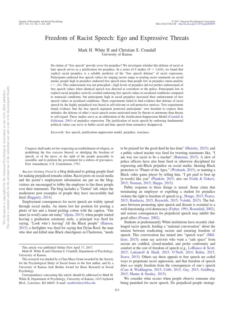 predict endorsement of free speech values when identical speech was directed at coworkers or the police. Participants low inexplicit racial prejudice actively avoided endorsing free speech values in racialized conditions comparedto nonracial conditions, but participants high in racial prejudice increased their endorsement of freespeech values in racialized conditions. Three experiments failed to find evidence that defense of racistspeech by the highly prejudiced was based in self-relevant or self-protective motives. Two experimentsfound evidence that the free speech argument protected participants’ own freedom to express theirattitudes; the defense of other’s racist speech seems motivated more by threats to autonomy than threatsto self-regard. These studies serve as an elaboration of the Justification-Suppression Model (Crandall &Eshleman, 2003) of prejudice expression. The justification of racist speech by endorsing fundamentalpolitical values can serve to buffer racial and hate speech from normative disapproval.