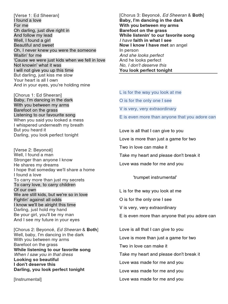 [Verse 1: Ed Sheeran] [Chorus 3: Beyoncé, Ed Sheeran & Both]