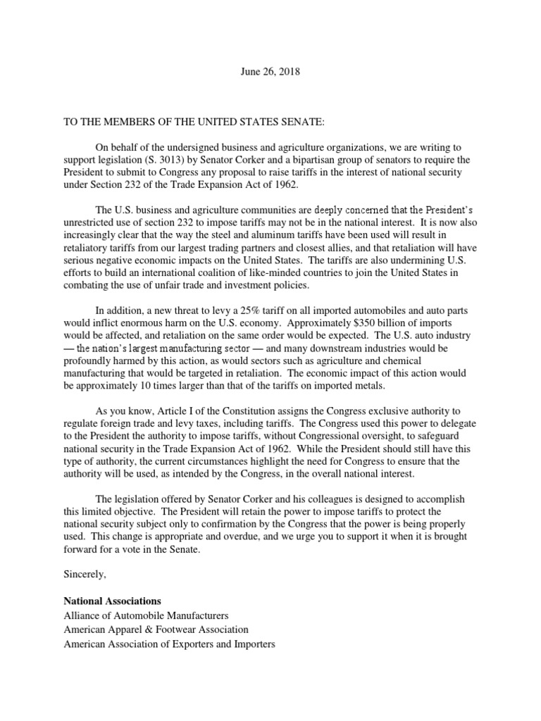 June 26, 2018 TO THE MEMBERS OF THE UNITED STATES SENATE: On behalf of the undersigned business and agriculture organizations, we are writing to support legislation (S. 3013) by Senator Corker and a bipartisan group of senators to require the President to submit to Congress any proposal to raise tariffs in the interest of national security under Section 232 of the Trade Expansion Act of 1962. The U.S. business and agriculture communities are