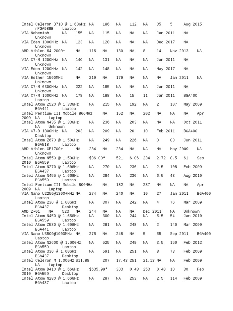Intel Celeron M 1.00GHz $11.89 207 17.43 251 21.13 NA NA Feb 2009