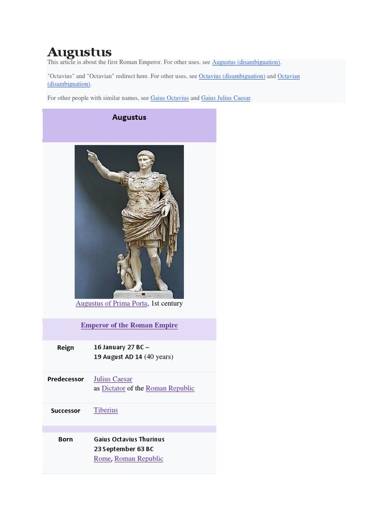 This article is about the first Roman Emperor. For other uses, see Augustus (disambiguation).
