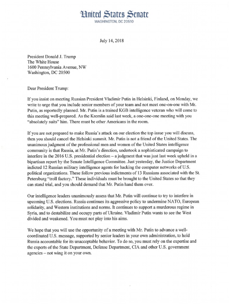 Today, a group of top Senate Democrats wrote to President Trump, urging him in the strongest possible terms to avoid meeting alone with Russian President Vladimir Putin.