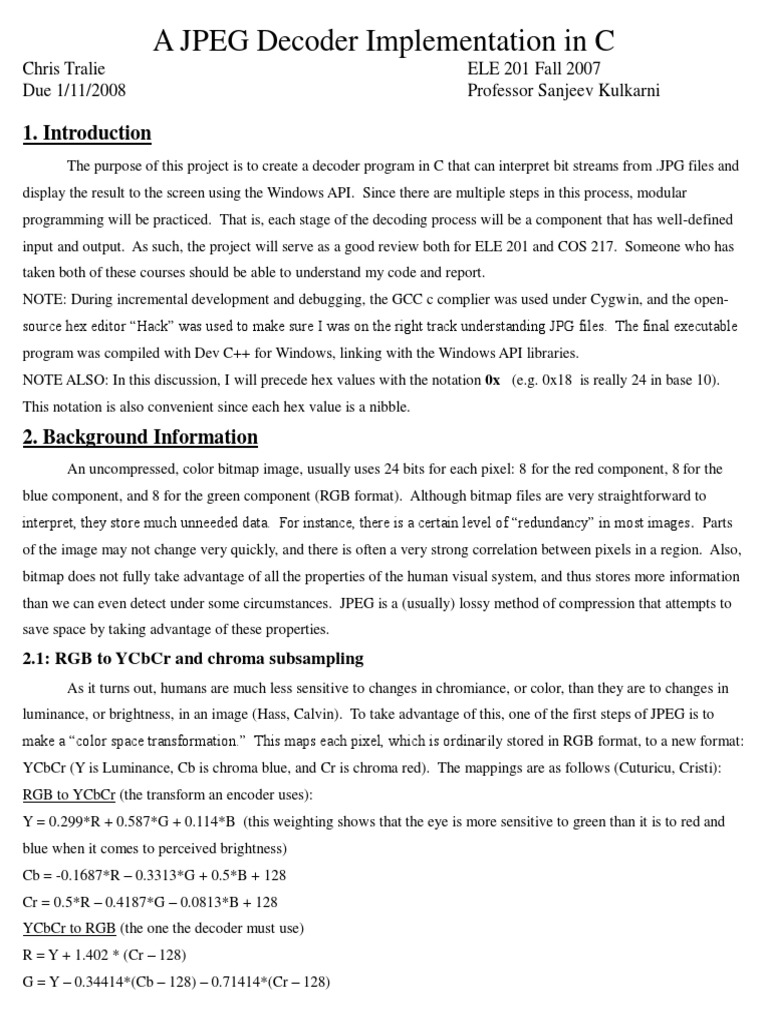 The purpose of this project is to create a decoder program in C that can interpret bit streams from .JPG files and