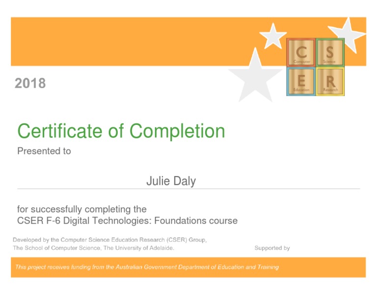 Julie Daly completed the CSER F-6 Digital Technologies: Foundations course and was presented with a Certificate of Completion. The certificate recognized that Julie Daly successfully finished the course on digital technologies for grades F-6.
