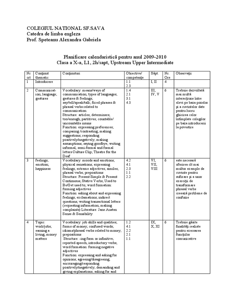 Nr Conţinut Conţinuturi Obiective/ Săpt. Nr. Observaţii