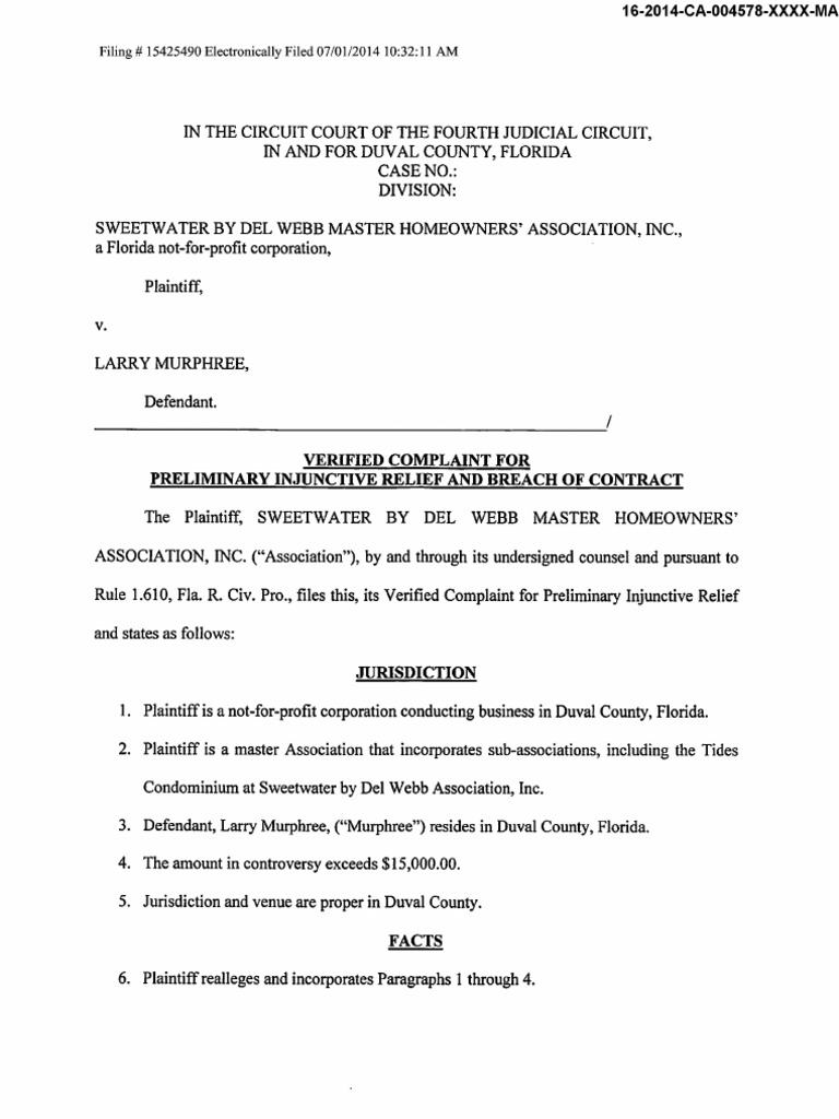 (14-CA-4578) Complaint For Preliminary Injunctive Relief and Breach of Contract (Verified)