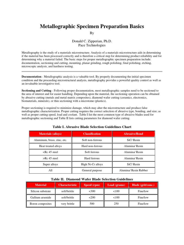 metallographic characterization. Proper cutting requires the correct selection of abrasive type, bonding, and size; as