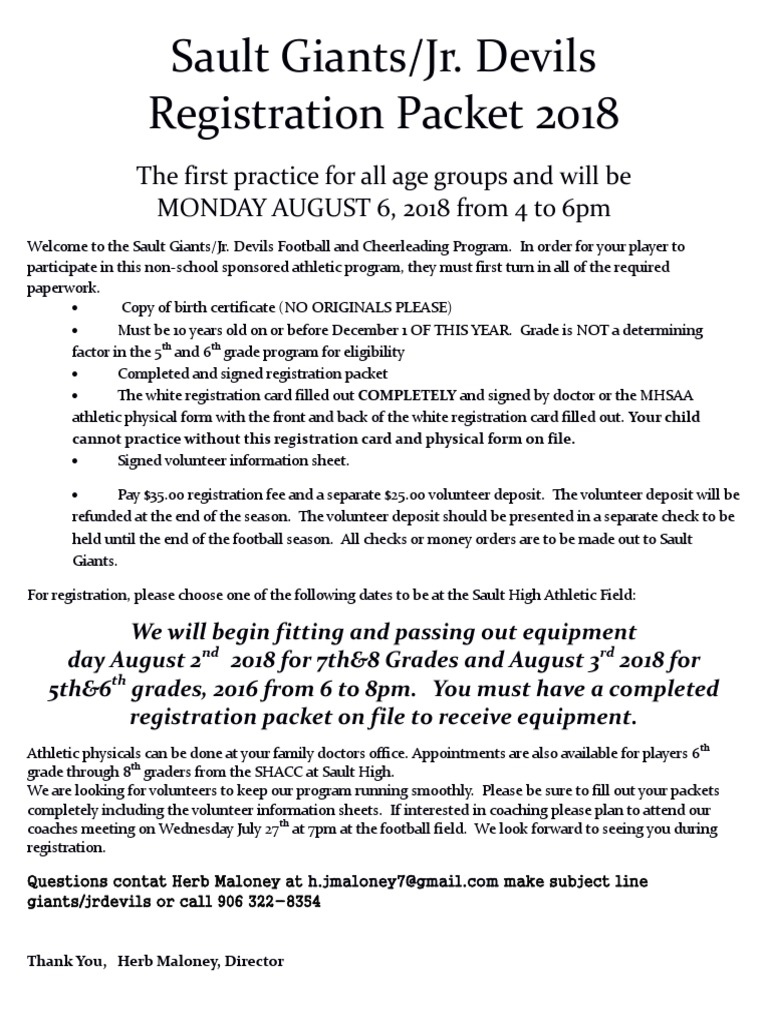 Welcome to the Sault Giants/Jr. Devils Football and Cheerleading Program. In order for your player to
