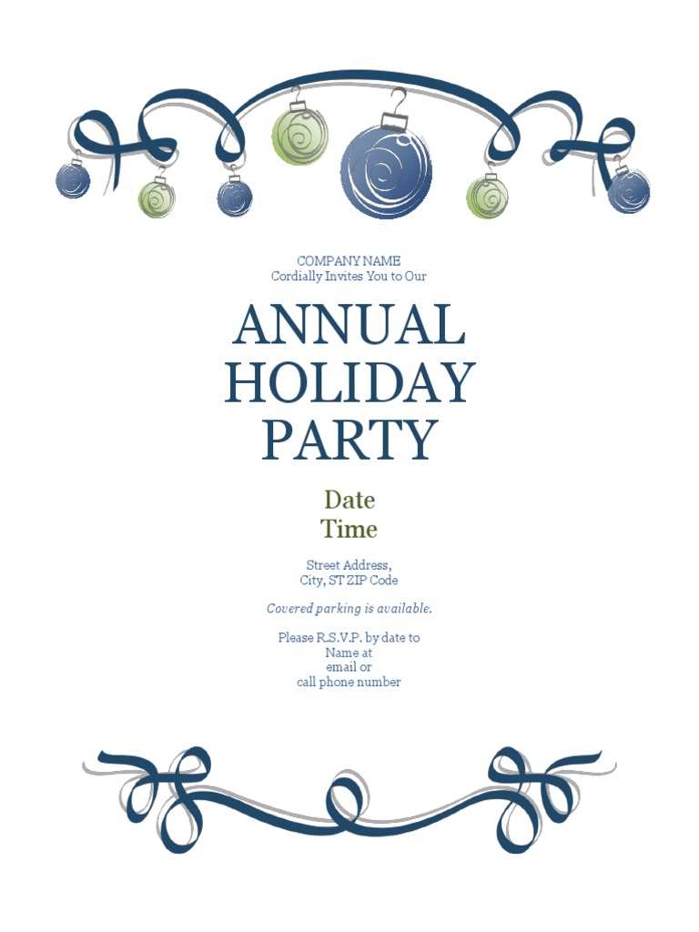 The company is inviting people to their annual holiday party at a specific date, time, and location. Covered parking will be available at the party location. Recipients are asked to RSVP by a certain date via email or phone to a contact person.