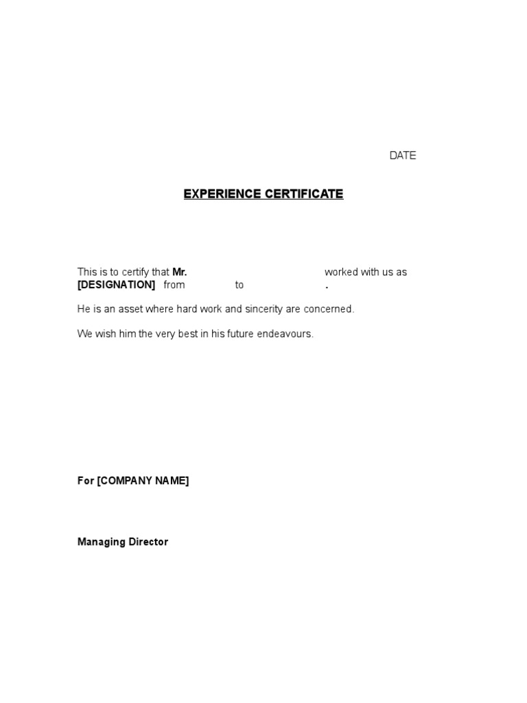 This certificate certifies that Mr. [NAME] worked as a [DESIGNATION] for [COMPANY NAME] from [DATE] to [DATE]. He is praised for his hard work and sincerity. The company wishes him the best in his future endeavors.