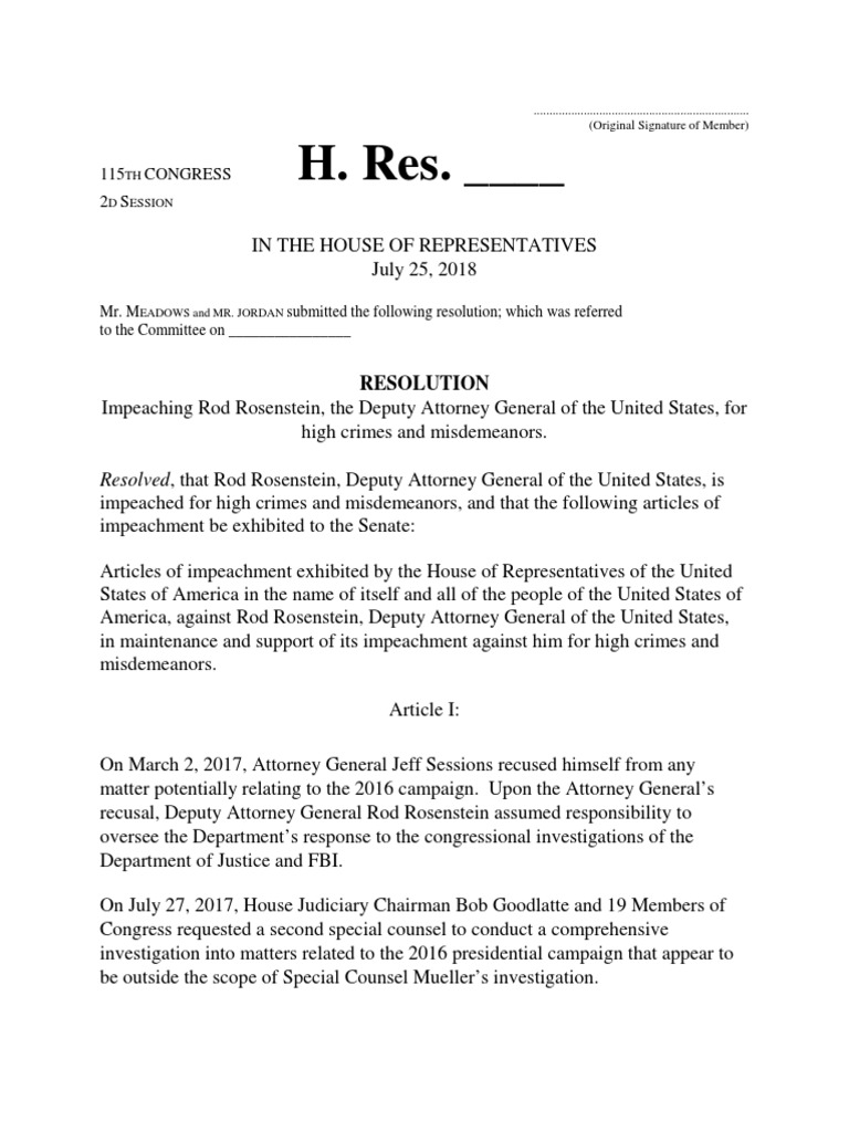 , that Rod Rosenstein, Deputy Attorney General of the United States, is impeached for high crimes and misdemeanors, and that the following articles of impeachment be exhibited to the Senate: Articles of impeachment exhibited by the House of Representatives of the United States of America in the name of itself and all of the people of the United States of America, against Rod Rosenstein, Deputy Attorney General of the United States, in maintenance and support of its impeachment against him for high crimes and misdemeanors. Article I: On March 2, 2017, Attorney General Jeff Sessions recused himself from any matter potentially relating to the 2016 campaign. Upon the Attorney General’s recusal, Deputy Attorney General Rod Rosenstein assumed responsibility to oversee the Department’s response to the congressional investigations of the Department of Justice and FBI. On July 27, 2017, House Judiciary Chairman Bob Goodlatte and 19 Members of Congress requested a second special counsel to conduct a comprehensive investigation into matters related to the 2016 presidential campaign that appear to be outside the scope of Special Counsel Mueller’s investigation.