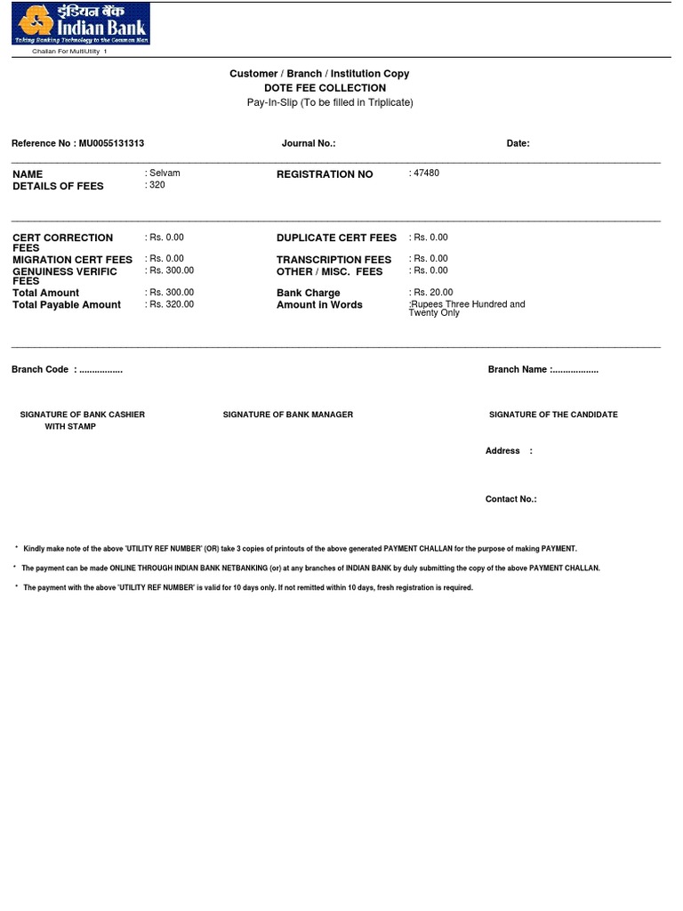 * The payment can be made ONLINE THROUGH INDIAN BANK NETBANKING (or) at any branches of INDIAN BANK by duly submitting the copy of the above PAYMENT CHALLAN.