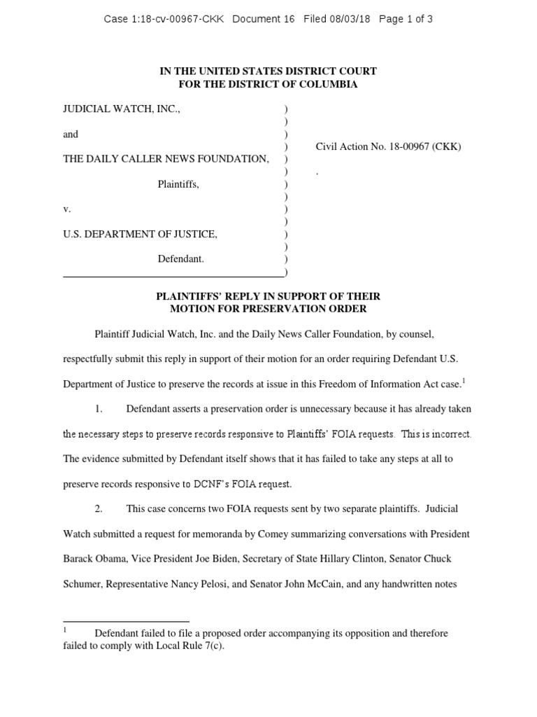Plaintiff Judicial Watch, Inc. and the Daily News Caller Foundation, by counsel, respectfully submit this reply in support of their motion for an order requiring Defendant U.S. Department of Justice to preserve the records at issue in this Freedom of Information Act case.