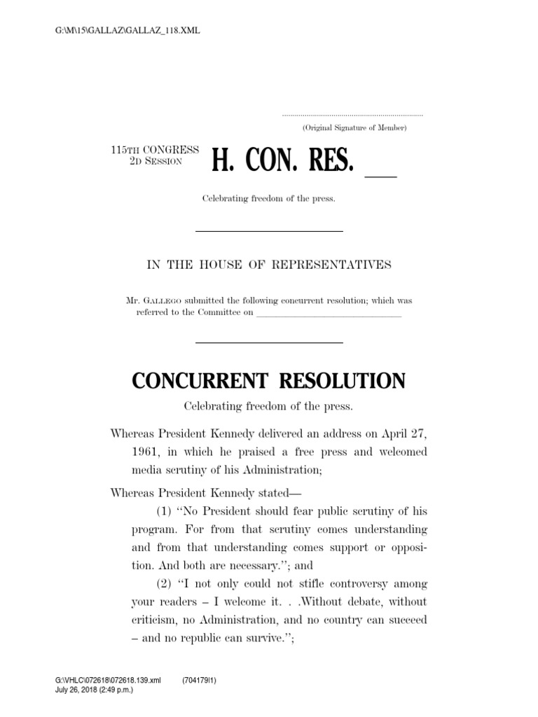 2 Whereas President Ronald Reagan, in proclaiming August 2, 1985, Freedom of the Press Day, extolled freedom of the press as ‘‘one of our most import freedoms and also one of our oldest’’; Whereas President Reagan further stated that ‘‘Our tradition of a free press as a vital part of our democracy is as im-portant as ever.’’; Whereas Congress through numerous joint resolutions has authorized and requested the President to issue a procla-mation in observance of ‘‘Freedom of the Press Day’’; and Whereas President Trump has consistently lambasted the media throughout his presidency, including— (1) tweeting on February 17, 2017, that, ‘‘The FAKE NEWS media (failing @nytimes, @NBCNews, @ABC, @CBS, @CNN) is not my enemy, it is the enemy of the American People!’’; (2) calling the press ‘‘Fake News’’ for reporting facts, including repeating President Trump’s own state-ments; (3) suggesting that the FBI should ‘‘consider put-ting reporters in prison’’; (4) calling the press ‘‘hypocrites’’ for criticizing the Helsinki summit with President Putin after President Trump stated publicly he believes Putin’s denials of elec-tion interference over the intelligence community (as such term is defined in section 3(4) of the National Security Act of 1947 (50 U.S.C. 3003(4)); (5) excluding Kaitlan Collins, a CNN reporter, on July 25, 2018, from a White House event given Ms. Col-lins’ critical questions of President Trump earlier in the