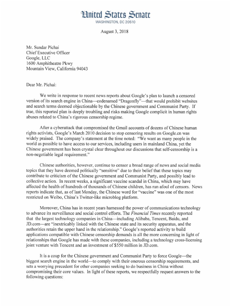 08 03 2018 Letter to Mr. Pichai Re Censorship in China
