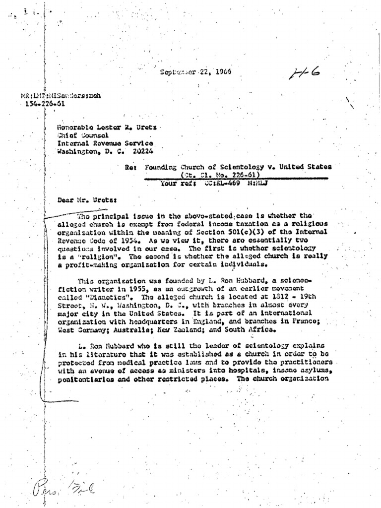 Assistant US Atty General requests assistance from the IRS regarding Scientology