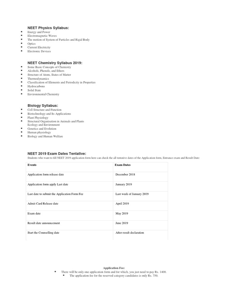 Students who want to fill NEET 2019 application form here can check the all tentative dates of the Application form, Entrance exam and Result Date: