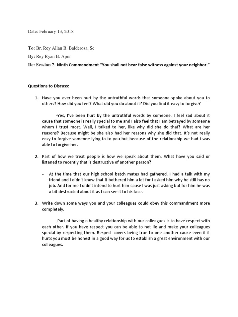 Re: Session 7- Ninth Commandment “You shall not bear false witness against your neighbor.”