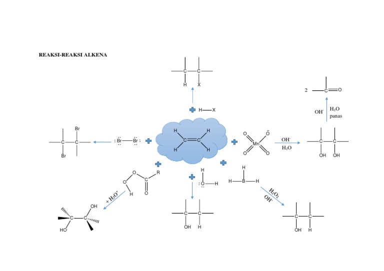 This document discusses reactions of alkenes. Alkenes can undergo addition reactions with bromine, hydrogen bromide, water, and hydroxide ions. Oxidation reactions of alkenes produce alcohols. Dehydration reactions of alcohols produce alkenes.