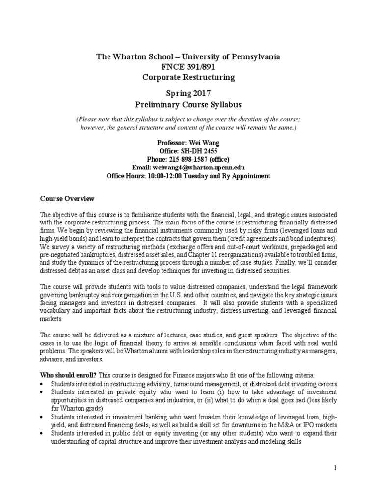 with the corporate restructuring process. The main focus of the course is restructuring financially distressed