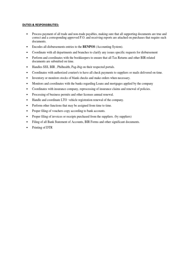 Process payment of all trade and non-trade payables, making sure that all supporting documents are true and