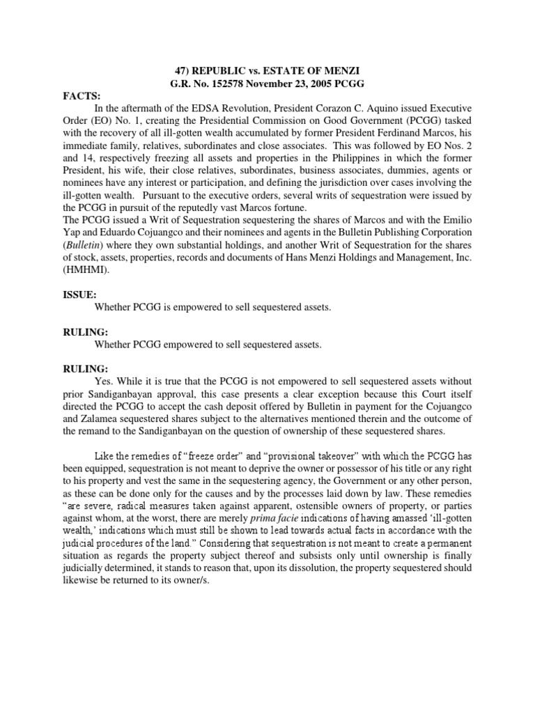 ill-gotten wealth. Pursuant to the executive orders, several writs of sequestration were issued by