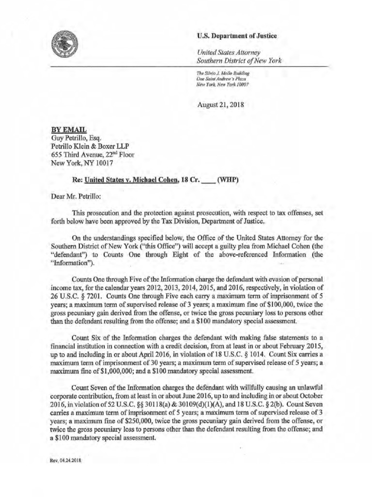 Michael Cohen Plea Agreement August 21