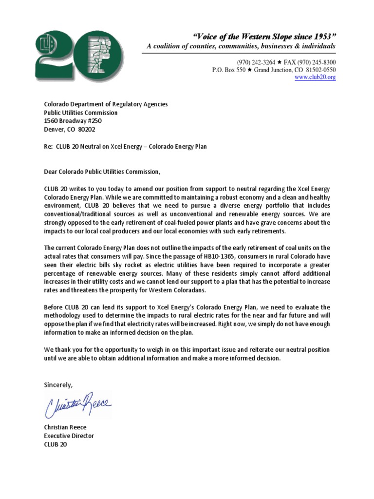 CLUB 20 writes to you today to amend our position from support to neutral regarding the Xcel Energy
