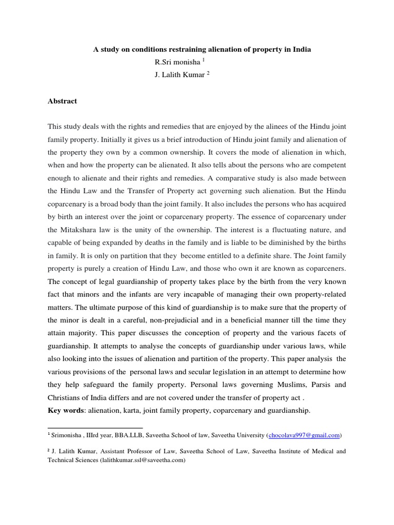 family property. Initially it gives us a brief introduction of Hindu joint family and alienation of
