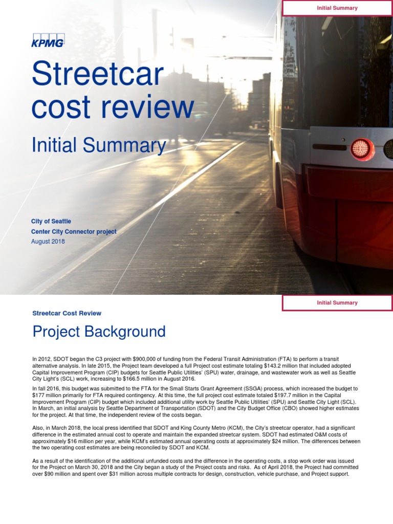 In 2012, SDOT began the C3 project with $900,000 of funding from the Federal Transit Administration (FTA) to perform a transit alternative analysis. In late 2015, the Project team developed a full Project cost estimate totaling $143.2 million that included adopted Capital Improvement Program (CIP) budgets for Seattle Public Utilities’ (SPU) water, drainage, and wastewater work as well asSeattle City Light’s (SCL)work, increasing to $166.5 million in August 2016. In fall 2016, this budget was submitted to the FTA for the Small Starts Grant Agreement (SSGA) process, which increased the budget to $177 million primarily for FTA required contingency. At this time, the full project cost estimate totaled $197.7 million in the Capital Improvement Program (CIP) budget which included additional utility work by Seattle Public Utilities’ (SPU) and Seattle City Light (SCL). In March, an initial analysis by Seattle Department of Transportation (SDOT) and the City Budget Office (CBO) showed higher estimates for the project. At that time, the independent review of the costs began. Also, in March 2018, the local press identified that SDOT and King County Metro (KCM), the City’s streetcar operator, had a significant difference in the estimated annual cost to operate and maintain the expanded streetcar system. SDOT had estimated O&M costs of approximately $16 million per year, while KCM’s estimated annual operating costs at approximately $24 million. The differences between the two operating cost estimates are being reconciled by SDOT and KCM. As a result of the identification of the additional unfunded costs and the difference in the operating costs, a stop work order was issued for the Project on March 30, 2018 and the City began a study of the Project costs and risks. As of April 2018, the Project had committed over $90 million and spent over $31 million across multiple contracts for design, construction, vehicle purchase, and Projectsupport.