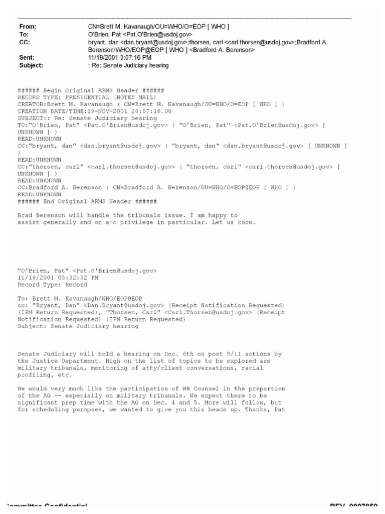 14/19/2001 3:07:16 PM Subject: : Re: Senate Judiciary hearing ###HH# Begin Original ARMS Header #HA### RECORD TYPE: PRESIDENTIAL (NOTES MAIL) CRRATOR:Brett M. Kavanaugh ( CN=Brett M. Kavanaugh/OU=WHo/O=ROP [ WHO | } CREATION DATE/TIME:19-NOV-2001 20:07:16. 00 SUBJECT:: Ret Senate Judiciary hearing T0:"0'Brien, Pat"