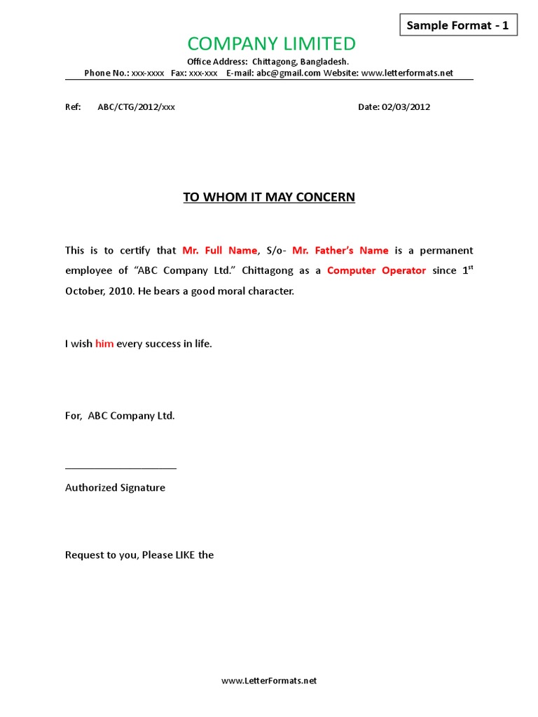 employee of “ABC Company Ltd.” Chittagong as a Computer Operator since 1st