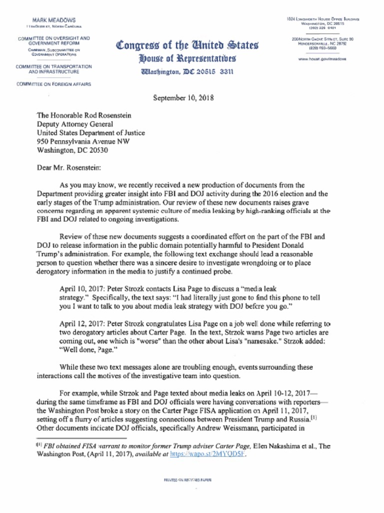 HARK MEADOWS su age toe tn ‘Soveraereearom Congress of the United States aie — Wouse of Representatives mote arcane commganeRacTRuEiRe ‘Washington, DE 20516 330i September 10, 2018 ‘The Honorable Rod Rosenstein Deputy Attorney General United States Department of Justice 980 Pennsylvania Avenue NW ‘Washington, DC 20530 Dear Mr. Rosenstein {As you may know, we recently received a new production of documents from the Department providirg greater insight into FBI and DOJ activity during the 2016 election and the early stages ofthe T>ump administration, Our review of these new documents raises grave conceme regarding en apparent systemic culture of media leaking by high-ranking officials at the FBI and DOI related to ongoing investigations. Review of these new documents suggests a coordinated effort on the part of the FBI and DOJ to release information in the public domain potentially harmful to President Donald ‘Trump's administration. For example, the following text exchange should lead a reasonable person to question whether there was a sincere desire to investigate wrongdoing orto place “derogatory information in the media to justify a continued probe. April 10, 2017: Pete Strozk contacts Lisa Page to discuss a “media leak strategy.” Specifically the text says: “I had literally just gone to find this phone to tell, ‘you I want to talk to you about media leak strategy with DOJ befere you go.” ‘April 12, 2017: Peter Strozk congratulates Lisa Page ona job well dane while refering to two derogatory articles about Carter Page. In the text, Str2ok wams Page two articles are coming out, one which is “worse” than the other about Lisa's “namesake.” Strzok added: “Well done, Page.” ‘While these wo text messages alone are troubling enough, events surrounding these interactions eal the motives of the investigative team into question. For example, while Strzok and Page texted about media leaks on April 10-12, 2017 ducing the same timeframe as FBI and DOJ officials were having conversations wit reporters the Washington Post broke a story onthe Cater Page FISA application cx April 11,2017, seting off uy of articles suggesting connections between President Trump and Rusia" “Other documents incicate DO! officials, specifically Andrew Weissmann participated in ‘©. FBY obtained FISA sarrant to monitor former Trump adviser Carter Page, Elen Nakashima etal, The ‘Washington Post, (Apo 11,2017), avilable at Hips ano. 2M Congress of the United States ‘Washington, DE 20515 authorized conversations wih te media during this same tie pit. Evidence suggests serior officals ate FB and DO} communicted wih other news oles beyond the Washington Post swell During our interviews with Peter Strozk and Lisa Page, FBI attereys consistently suggested witnesses could not answer questions due to the US Attorneys" Manual’s policy for ‘ongoing investigations. However, documents strongly suguest that these same witnesses discussed the ongoing investigations multiple times with individuals ouside ofthe investigative team on a regular bis (Our task forte continues to receive troubling evidence that the ractice of coordinated ‘media interactions continues to exist within the DOJ and FBI, While this activity may be authorized and not part of the inappropriate bchavior highlighted above, it fails to advance the private march to justice, and as such, warrants your attention to end this practice In light ofthe new information, our task force is requesting to review text messages, emails, and written communication from FBI and DOS officials Stu Evans, Mike Kortan, and Joc Pieatka between Jute 2016 to June 2017. To be clea, we are not suggesting wrongdoing on the part of Evans, Kortan, and Pientka and, infact, previously reviewed documents suggest that some ofthese individuals may share the committees’ same concems, However, these adaltional documents, with anemphasis on communication between the aforemeniioned individuals and Peter Strozk, Andrew MeCabe, Lisa Page. Bruce Ohr and Andrew Weissmann, would provide critical insight into the backdrop ofthe Russia investigation, ‘Your attention to this matter is greatly appreciated Sincerely, Mark Meadows Member of Corgress ccc: The Honorable Bob Goodlatte, Chairman, Committee onthe Judiciary The Honorable Trey Gowdy, Chairman, Committee on Oversight and Government Reform