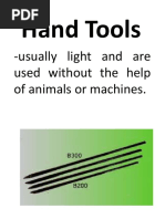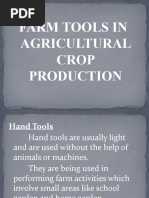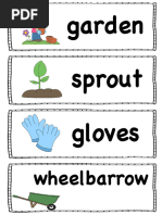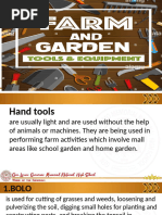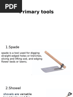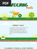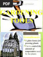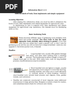 This document contains images of common gardening tools including a spading fork, rake, hoe, hand cultivator or trowel, garden hose, shovel, garden gloves, and wheelbarrow or garden cart.
