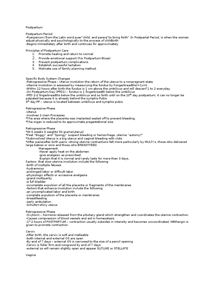 -Within 12 hours after birth the fundus is 1 cm above the umbilicus and will descenf 1 to 2 everyday.