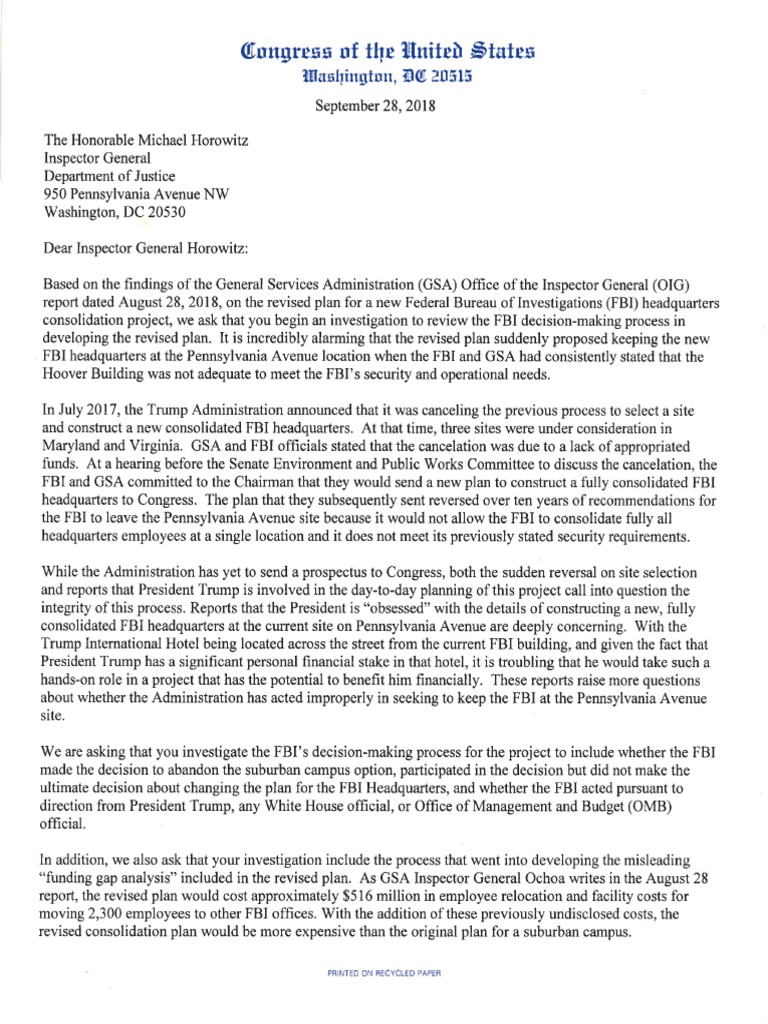 House lawmakers called on the inspector general for the Department of Justice to look into the circumstances that led the FBI to recommend keeping its headquarters in downtown D.C. instead of moving it to a suburban location.