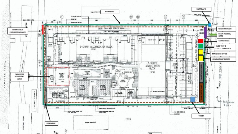 The diagram shows a site layout with different work areas including a silt trap, emergency exit, main access gate, guard house, cube test collection area, control offices, worker homestay area, barbender and carpenter yards, drainage, and toilet facilities. The diagram provides a high-level overview of the site organization and infrastructure.