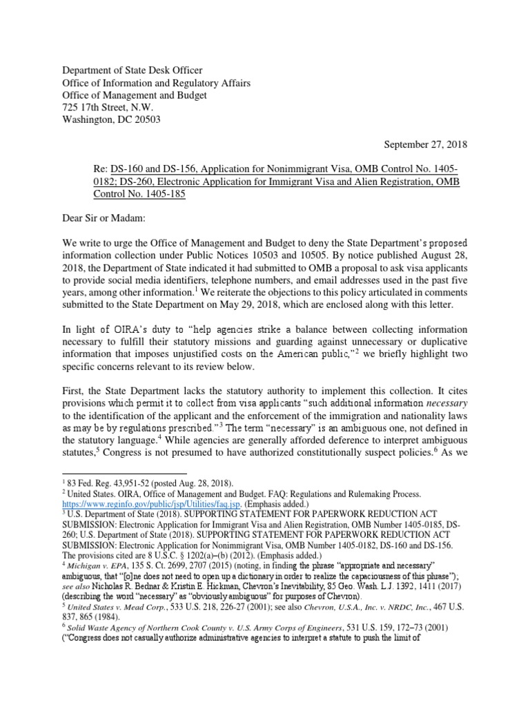 2018, the Department of State indicated it had submitted to OMB a proposal to ask visa applicants