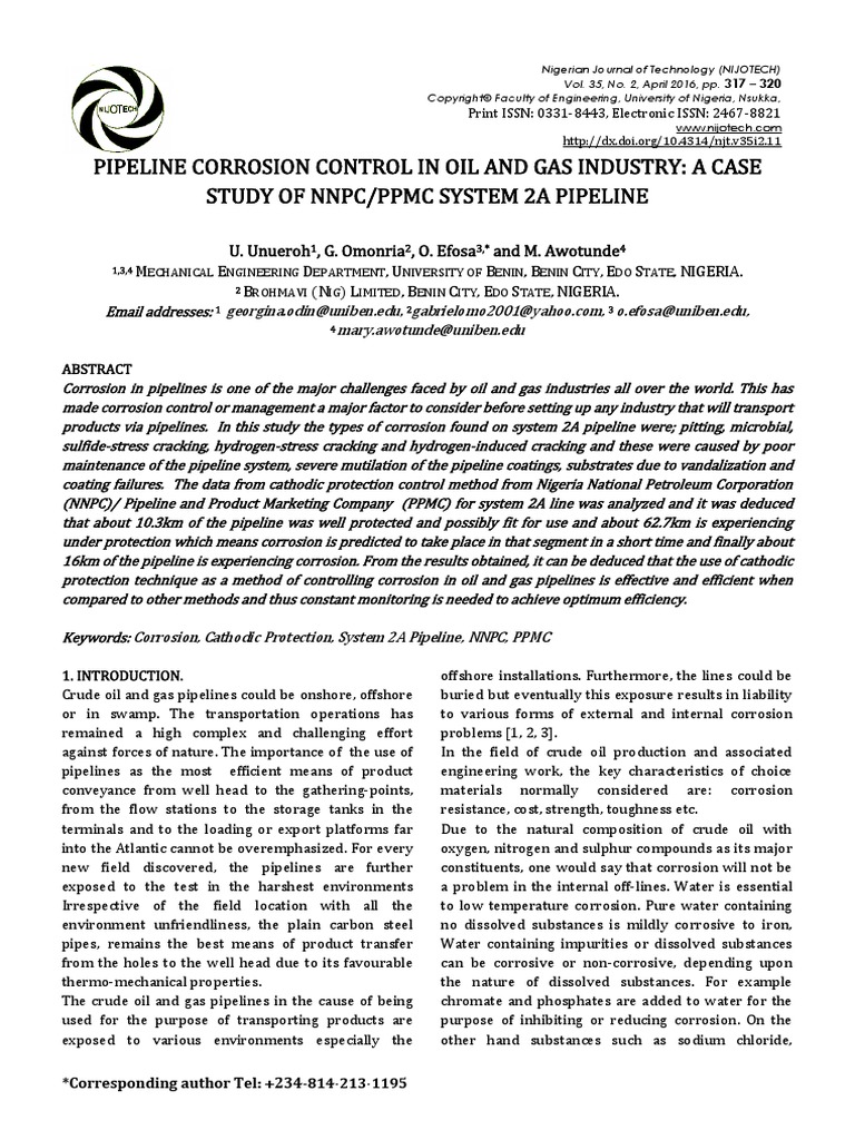 PIPELINE CORROSION CONTROL IN OIL AND GAS INDUSTRY: A CASE OF NNPC/PPMC SYSTEM 2 PIPELINE U. Unueroh et al